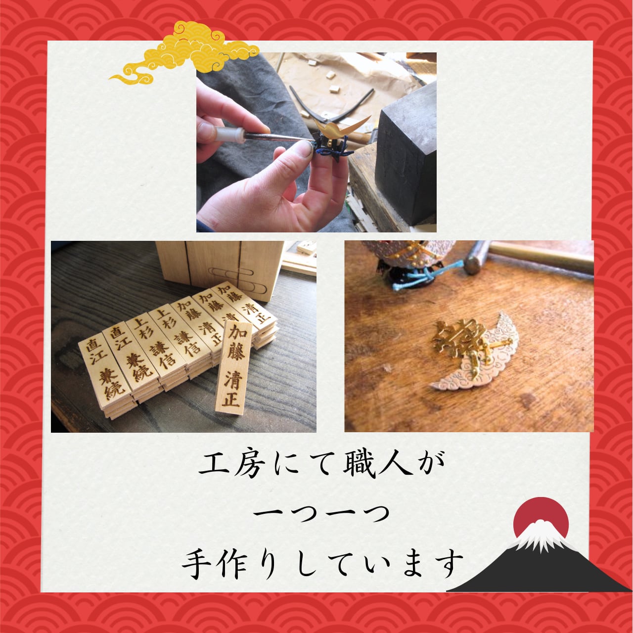 名将をモチーフに、それぞれの兜の意匠を繊細に表現しました。